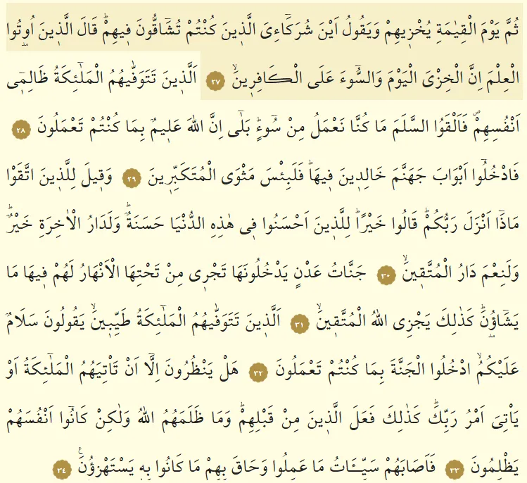 - Sonra kıyamet gününde Allah onları rezil eder ve der ki: "Uğruna mücadele ettiğiniz ortaklarım hani nerede?" Kendilerine ilim verilmiş olanlar, "Şüphesiz bugün rezillik ve kötülük inkâr edenlerin başına!" derler.