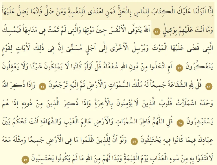 42. Allah, ölüm vakitleri geldiğinde insanları vefat ettirir, ölmeyenleri de uykularında ölmüş gibi yapar. Ölümüne hükmettiklerini tutar, diğerlerini ise belli bir süreye kadar (hayata) salar. Kuşkusuz bunda iyice düşünenler için dersler vardır.