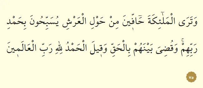 75. Meleklerin de rablerine hamd ile yüceliğini dile getirerek arşın çevresini kuşattıklarını görürsün. Böylece insanlar arasında doğruluk ve adalet ölçüsüne göre hüküm verilir ve şöyle denir: Bütün övgüler âlemlerin rabbi olan Allah içindir.