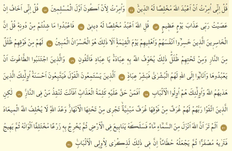 11. De ki: "Kuşkusuz bana, kendisine içten bir inanç ve bağlılık göstererek Allah'a ibadet etmem emredildi.