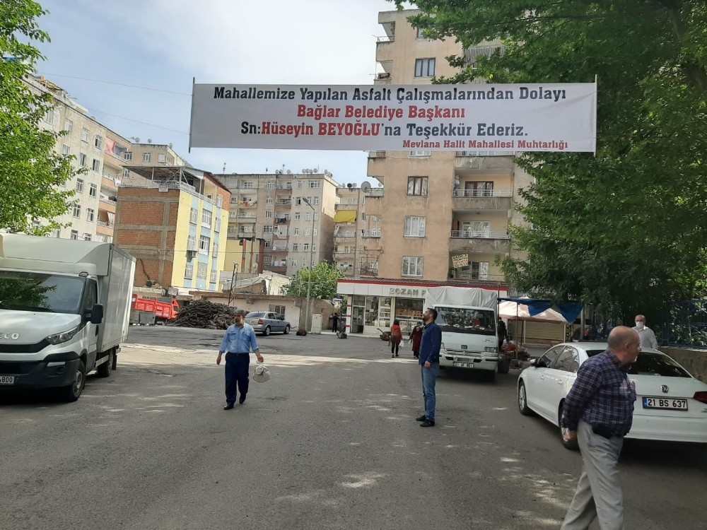 Covid-19 önlemleri gereği maske,eldiven ve sosyal mesafe kurallarına uyarak görev yapan ekiplerin çalışmasından sonra güzel bir görünüme kavuşan bölgede yaşayan vatandaşlar, "Mahallemize yapılan asfalt çalışmasından dolayı Bağlar Belediye Başkanı Hüseyin Beyoğlu’na teşekkür ederiz” pankartı astı. Yapılan çalışmaları inceleyen Bağlar Belediye Başkanı Hüseyin Beyoğlu, çevredeki vatandaşlarla görüştü. Yapılan hizmetin kendilerini mutlu ettiğini belirten vatandaşlar, Beyoğlu’na teşekkür etti.
