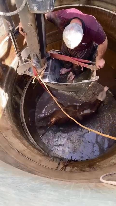 Diyarbakır’da 7 metrelik su kuyusuna düşen boğa, belediye ekiplerince iş makinesiyle çıkarılarak sahibine teslim edildi. Kurtarma ani ise ekipler tarafından saniye saniye cep telefonuyla kaydedildi. Diyarbakır’ın merkez Sur ilçesine bağlı Koyungüden Mahallesi’nde sahibi tarafından otlatmaya çıkarılan boğa, mahalleden 500 metre uzaklıkta bulunan kırsal alandaki 7 metre derinliğindeki su kuyusuna düştü. Sahibinin yardım istediği mahalleli, hayvanı kendi çabalarıyla çıkartmaya çalıştı, ancak başarılı olmaması üzerine belediye ekiplerinden yardım istedi. İhbar üzerine bölgeye sevk edilen Sur ilçe Belediyesi Fen İşleri ekipleri, 300 kiloluk boğayı kurtarmak için çalışma başlattı. Yapılan çalışmaların sonucundan halata bağlanan boğa, iş makinesi ile yukarıya çekilerek kurtarılarak sahibine teslim edildi. Kurtarma anı ekipler tarafından saniye saniye cep telefonu kamerasıyla kaydedilirken, boğanın sahibi yapılan çalışmalardan dolayı ekiplere teşekkür etti.