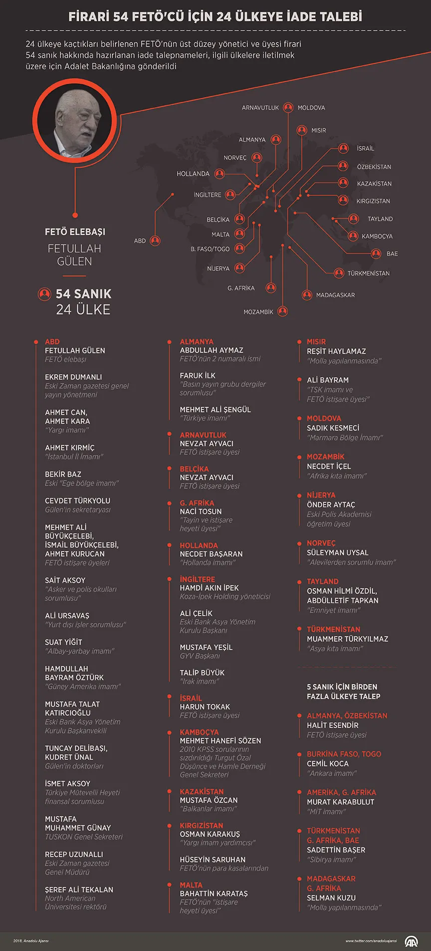 FETÖ'nün üst düzey yöneticileri ve üyelerinin, ABD, İngiltere, İsrail, Almanya, Belçika, Hollanda, Norveç, Moldova, Arnavutluk, Kamboçya, Tayland, Madagaskar, Güney Afrika, Malta, Burkina Faso, Togo, Nijerya, Birleşik Arap Emirlikleri, Mozambik, Mısır, Türkmenistan, Kırgızistan, Özbekistan ve Kazakistan'da bulundukları belirlendi.