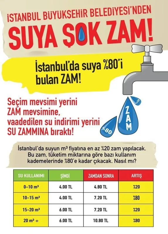 İstanbul Büyükşehir Belediye Başkanı Ekrem İmamoğlu su tarifeleriyle ilgili olarak büyük bir skandala imza attı. Sunulan yeni teklifte, mevcut tarife aboneler aleyhine değiştirilerek, iki kademede yüzde 80’e varan zam talep edildi. Zam skandalını ortaya çıkaran eski İSKİ Yönetim Kurulu Üyesi Sıddık Eraslan, şunları anlattı: Burada kademe 10 metreküpe düşürülerek üzerindeki her harcamaya yüzde 80 zamla 7,20 lira bedelle tahsilat yapılacaktır. Yani bu zam dezavantajlı kesimin faturalarına yüksek bir bedelle yansıyacaktır. Önceki tarifede 16 metreküp ve üzeri fiyatı 6 lira iken 20 metreküp esasına göre fiyat 10,80 lira olmuştur. Bahsedildiği gibi zam oranı yüzde 20 değil, gizlenerek yüzde 80’e varmıştır” dedi.
