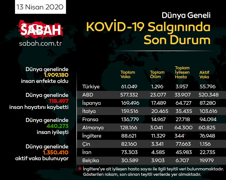 Son Dakika: Sabah.com.tr verilerine göre corona virüsü kaynaklı Kovid-19 vaka sayısı– 13 Nisan verileri
