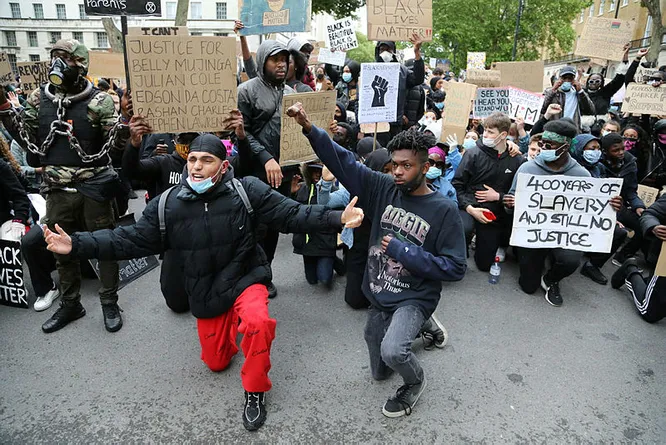 İngiltere’nin başkenti Londra’da binlerce kişi ABD’de George Floyd’un polis tarafından öldürülmesini protesto etti. Protestocular, ABD Büyükelçiliğine yürüdü. Polis büyükelçilik etrafında geniş güvenlik önlemleri aldı. Protestoya katılanlara maske ve el dezenfektanı dağıtılırken, Floyd için sessiz oturma eylemi yapıldı.