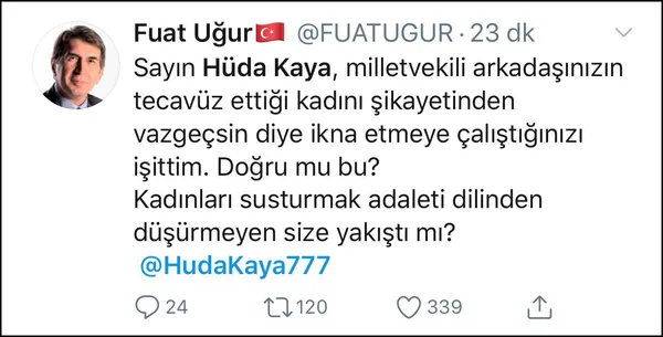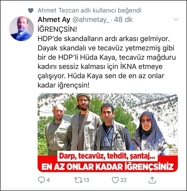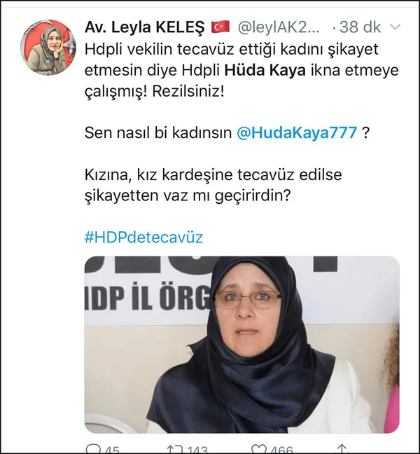 HDP'de skandalların ardı arkası gelmiyor. Dayak skandalı ve tecavüz yetmezmiş gibi bir de HDP'li Hüda Kaya, tecavüz mağduru kadını sessiz kalması için İKNA etmeye çalışıyor. Hüda Kaya sen de en az onlar kadar iğrençsin!" dedi.