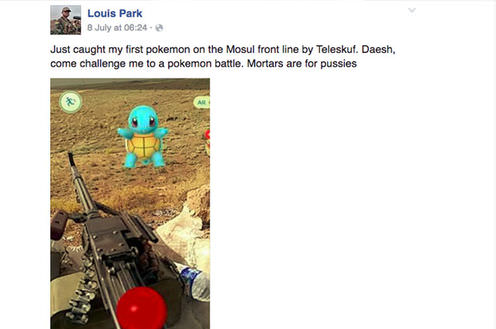 DAEŞ'le mücadele kapsamında bölgeye gönüllü olarak giden 26 yaşındaki ABD askeri Louis Park, DAEŞ işgali altındaki Musul cephesinde Pokemon Go oynarken çektiği ekran görüntülerini sosyal medyadan paylaştı.