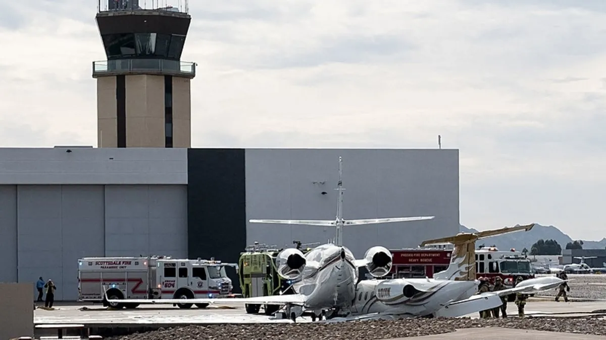 ABD'nin Arizona eyaletindeki Scottsdale Havalimanı'na iniş yapan Learjet 35A tipi özel jet, pistten çıkarak park halindeki Gulfstream 200 tipi jete çaptı.