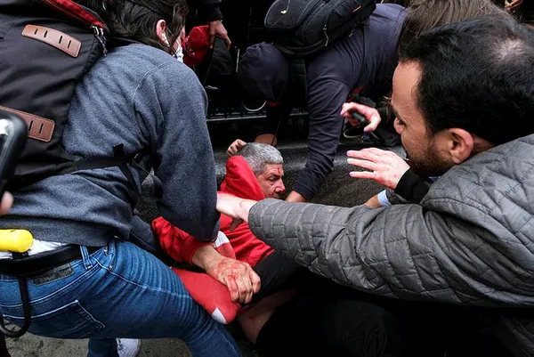 O sırada bir Trump destekçisini yakalayan Biden taraftarı protestocular kafasına atılan yumruklarla yaralandı. Kaçmaya çalışan kişi, o sırada başka bir protestocu tarafından yakalanarak linç devam etti. Kırmızı kapüşonlu Trump destekçisi, daha sonra yere yığıldı ve kalabalık tarafından yumruk ve tekme ile saldırıya uğradı.