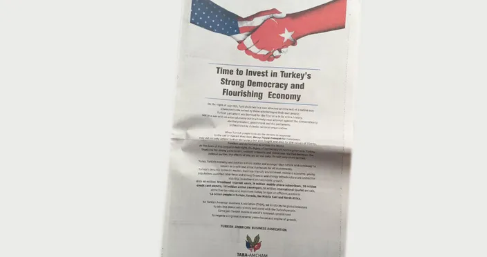 Amerikan basınında darbe girişiminin sorumlularını açıkça dile getiriyor olmakla da bir ilk niteliği taşıyan çağrı, ABD'nin en çok okunan gazetelerinden New York Times başta olmak üzere çeşitli İngilizce gazete ve yayınlarda tam sayfa reklamlarla yayınlandı. Derneğin bu çağrıyı yayınlama zamanlaması ise manidar oldu. 20-26 Eylül 2016 tarihlerinde 71. Birleşmiş Milletler Genel Kurul'una katılmak üzere Cumhurbaşkanı Recep Tayip Erdoğan da dahil olmak üzere pek çok dünya liderlerinin New York'ta bulunduğu tarihlerde, TABA AMCHAM global yatırımcıları Türkiye'nin demokrasi zaferine katılmaya ve Türk halkının yanında yer almaya davet etti.