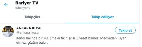 Oktay Yaşar'ın editörlüğünü yaptığını belirttiği Bariyer TV'nin internet uzantısına ulaşılamazken sitenin Twitter hesabından takip ettiği 3 kullanıcı içerisinden en dikkat çekeni 'Ankara Kuşu' oldu. Bariyer TV'nin ise Ocak 2015 tarihinde Twitter'a katıldığı görülüyor.