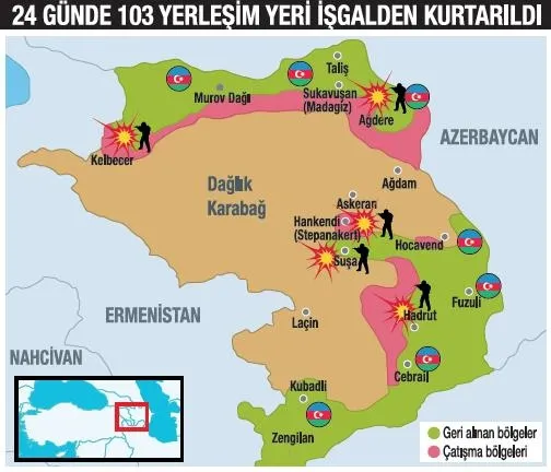 Topraklarını işgalci Ermenistan’dan bir bir kurtaran Azerbaycan ordusunun ‘kadim medeniyet’ olarak gördüğü Şuşa’ya doğru ilerleyişi sürüyor