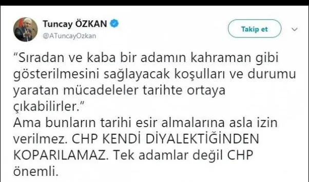 İnce'nin bu sözlerine karşılık Kılıçdaroğlu cephesinden ilk yanıt Tuncay Özkan'dan geldi. Özkan sosyal medya üzerinden bir açıklama yaptı: "Sıradan ve kaba bir adamın kahraman gibi gösterilmesini sağlayacak koşulları ve durumu yaratan mücadeleler tarihte ortaya çıkabilirler.' Ama bunların tarihi esir almalarına asla izin verilmez. CHP kendi diyalektiğinden koparılamaz. Tek adamlar değil CHP önemli."