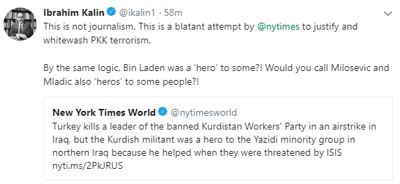 Cumhurbaşkanlığı Sözcüsü İbrahim Kalın, New York Times'ta yer alan bir habere tepki göstererek "Bu gazetecilik değil. Bu, New York Times tarafından PKK terörizmini meşrulaştırmak ve örtbas etmek için açıkça bir girişim." değerlendirmesinde bulundu.