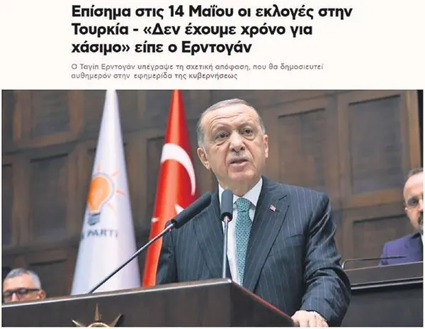 Yunan Kathimerini Gazetesi: Erdoğan'ın seçimlere resmiyet kazandıran imzayı atmasını manşetten duyurdu. 6'lı koalisyonun anlaşmazlıklarla dolu bir süreç içinden zor çıktığına değindi.