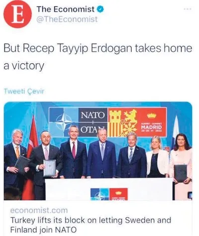Economist (İngiltere): Erdoğan eve zaferle dönüyor. Futbolculuk geçmişi olan Erdoğan, Finlandiya ile İsveç'e veto sinyaliyle yeşil sahalardaki gibi profesyonel bir faul yaptı ve uluslararası siyasette istediğini alarak golü attı. Rusya böylesine bir tehdit ortamı yaratmışken bu hamle korkutucu olduğu kadar etkiliydi.