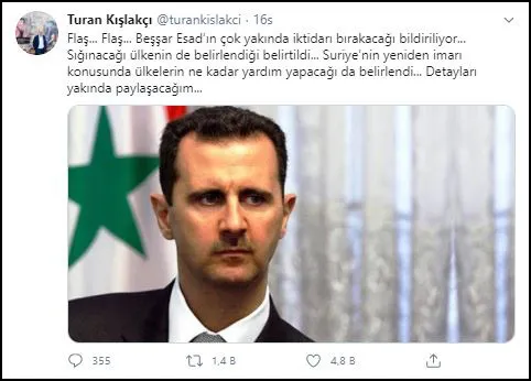 Suriye'de 9 yıldır süren iç davaşın ardından Beşşar Esad'ın iktidarı bırakacağı iddia edildi. Türk Arap Medya Derneği Başkanı Turan Kışlakçı, sosyal medyadan yaptığı açıklamasında Beşşar Esad'ın görevi bırakacağını ve belirlenen bir ülkeye sığınacağı belirtti.