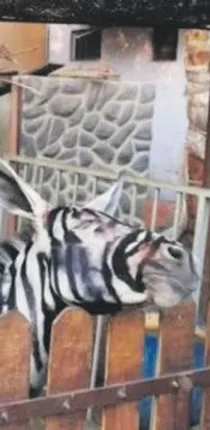 MISIR'DA bir hayvanat bahçesinde eşek, zebra gibi görünmesi için boyandı. Başkent Kahire'deki hayvanat bahçesine giden 18 yaşındaki öğrenci Mahmud Serhan bu "kamuflajı" farkederek eşeğin fotoğrafını çekti ve sosyal medyada paylaştı. Fotoğraf sosyal medyada hızla yayılırken, yerel TV kanalına konuşan Serhan, her iki hayvanı da daha önce gördüğünü ve bu ayrımı kolayca yapabildiğini söyledi
