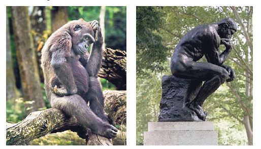 Fransa'daki La Vallee des Singes Hayvan Parkı sakinlerinden bir goril, derin derin düşünürken verdiği pozla akıllara dünyaca ünlü "Düşünen Adam" heykelini getirdi. Fransız sanatçı Auguste Rodin'in 1902 yılında yaptığı heykelle neredeyse aynı şekilde durduğu sırada gorili görüntülemeyi başaran 20 yaşındaki Sophie Narses, "Genç goril çok dertli gibiydi. Oturduğu ağacın üstüne derin düşüncelere dalmıştı. Bir ara kendisini görüntülediğimi fark etti. Ancak istifini hiç bozmadan düşünmeye devam etti" dedi.