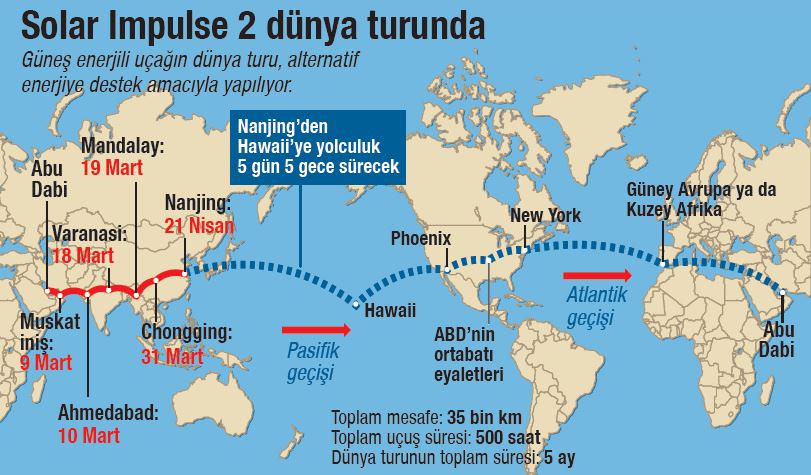 Sadece güneş enerjisiyle dünyanın çevresini turlayan Solar Impulse 2'nin mart ayında başlayan tarihi yolculuğu sürüyor. Alternatif enerjiyi desteklemek için düzenlenen yolculukta uçağın İsviçreli mucitleri Bertrand Piccard ve Andre Borschberg nöbetleşe pilotluk yapıyor. Abu Dabi'den başlayan yolculukta en zor etap ise Pasifik Okyanusu. Çin'in Nanjing şehrinden Hawaii'ye 8500 kilometre yol kat edilerek 5 gün 5 gece sürecek uçuşu Borschberg yönetecek. 55 derecelik ısı değişimi ve uykusuzlukla savaşacak olan 62 yaşındaki Borschberg, bunu kendini keşfetmek için fırsat olarak görüyor.