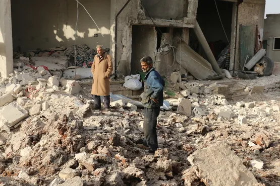 Beyaz Baretliler onlarca evin zarar gördüğü hava saldırısı sonrası enkaz altında arama kurtarma çalışmalarına devam ediyor.