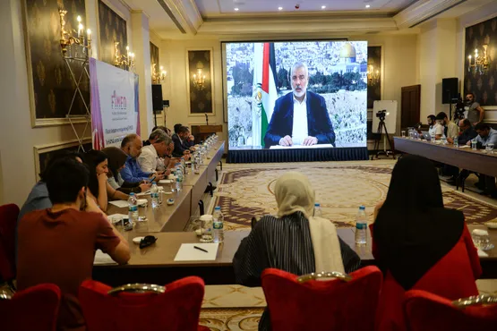 Türk Arap Medya Derneği ile Filistin İletişim ve Medya Derneği'nin İstanbul'da ortaklaşa düzenlediği basın toplantısına İsmail Haniye video konferansla katıldı.