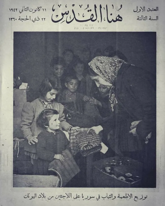 11 Ocak 1942 tarihli "Burası Kudüs" (Hune el Kudüs) isimli Arapça gazetenin manşetinde, Suriyeli kadınların Yunan çocuklara giysi dağıttığı bir fotoğraf bulunuyor. Gazetede, "Yunanistan'dan Suriye'ye mülteci olarak gelenlere yemek ve kıyafet dağıtıldı." ifadesi yer alıyor.