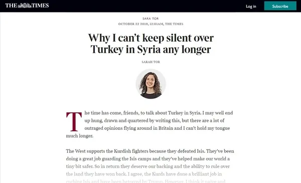 İngiliz The Times gazetesinde yayımlanan yazısında, "PKK/YPG-PYD Kürdistan için savaşıyordu ve bu da önlerine çıkan herkesten kurtulmak anlamına geliyordu" diyen Sara Tor, "İşte tam da bu noktada Türklerin bakış açısını görüyorum. YPG'nin amaca ulaşması için terörü kullanması kabul edilemez. YPG/SDG, Türkiye'deki terör örgütü PKK'nın bir uzantısıdır. PKK'nın Türklere ve Kürtlere verdiği zararı ve yaşattığı acıyı bizzat gördüm. Batı halkı, PKK/YPG-PYD'yi zararsız kurtarıcılar olarak görmekte acele ediyor. Ve bir tampon bölge kesinlikle gerekiyor" dedi.
