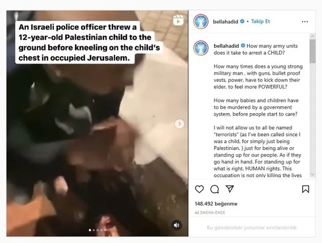 Resmi Instagram hesabında 52 milyona yakın takipçisi bulunan ünlü model, Filistinlilere yapılan zulüm nedeniyle bir kez daha paylaşımda bulundu