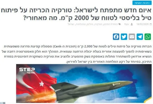 Türkiye'nin Cenk programı kapsamında 2.000 kilometre menzile sahip balistik füze geliştirdiğini duyurması, İsrail'de endişelere yol açtı. İsrail merkezli Nziv haber sitesi, "İsrail için yeni bir tehdit gelişiyor: Türkiye 2.000 km menzilli balistik füze geliştirdiğini açıkladı! Bunun arkasında ne var?" başlıklı haberinde, Cenk programının Türkiye'nin bölgesel bir güç olarak bağımsız caydırıcılık kapasitesine ulaşma hedefinde önemli bir sıçrama anlamına geldiğini belirtti. Habere göre bu adım, Başkan Recep Tayyip Erdoğan'ın Batı silah tedarikine bağımlılığı azaltma ve özellikle İsrail-İran arasındaki bölgesel gerilim ortamında Türkiye'yi Orta Doğu'da daha baskın bir aktör olarak konumlandırma stratejisinin parçası olarak değerlendiriliyor.