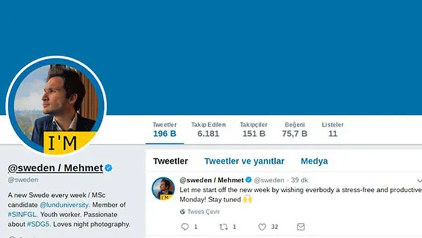 Türk öğrenci Mehmet Murat Doğan, 1 hafta boyunca İsveç'in resmi Twitter hesabından paylaşımlar yapacak. Doğan, 151 bin takipçili @sweden hesabının yönetimini bu sabah itibarıyla devraldı.