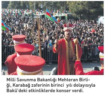 Azerbaycan'ın başkenti Bakü'de Karabağ zaferinin birinci yılı dolayısıyla yürüyüş düzenlendi. Zafer Günü kutlamaları kapsamında Bakü'nün Azneft Meydanı'ndan başlayan yürüyüşe, askeri lise öğrencileri, Sınır Hizmetleri Komutanlığına bağlı süvari birlikleri, Karabağ Savaşı gazileri ve vatandaşlar katıldı. Askeri bandonun marşları ile başlayan yürüyüşte askeri lise öğrencileri, savaşın 44 gün sürmesine atıfta bulunulan 440 metrelik Azerbaycan bayrağını taşıdı.