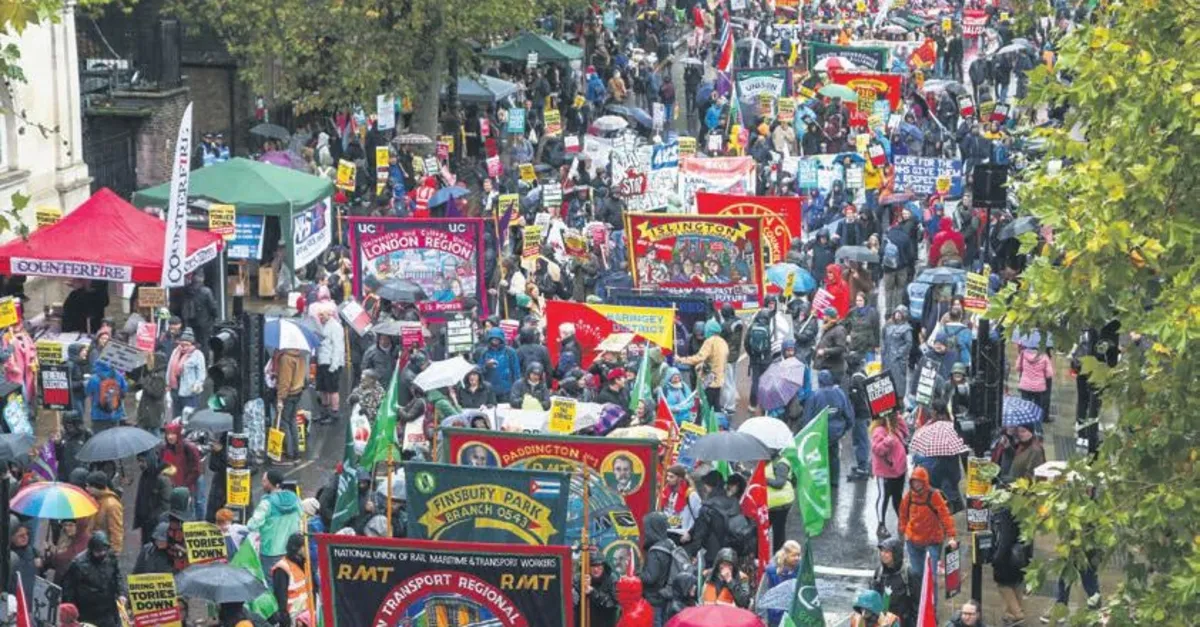 CHP Genel Başkanı Kemal Kılıçdaroğlu'nun finans çevrelerinden para bulmak için gittiği İngiltere'de halk hayat pahalılığından, yetersiz ücretlerden, gıda ve enerji krizinden dolayı hükümeti protesto etti. Bu yıl üç kez başbakan değişen İngiltere'de siyasi kriz ve ekonomik kriz nedeniyle toplumsal kaos giderek derinleşiyor. 45 gün boyunca görevde kalan Liz Truss'ın istifasının ardından Rishi Sunak'ın başbakanlık görevine gelmesi ekonomik krizle boğuşan halkının öfkesini dindirmedi. Faiz artışının ardından yapılması beklenen zamlar nedeniyle binlerce kişi başkent Londra'da sokağa indi. Embankment tren istasyonu önünde toplanan çok sayıda sivil toplum kuruluşu ve işçi sendikasına üye göstericiler, iktidardaki Muhafazakar Parti hükümetinin ekonomi ve göçmen politikalarını protesto etti.