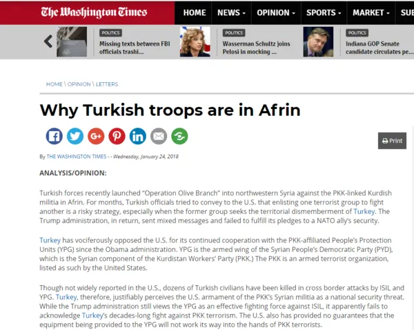 Washington Times gazetesinde Editöre Mektuplar köşesinde yer alan analiz mektubunda ABD'nin terör örgütü YPG'ye yapılan silah yardımı masaya yatırıldı.