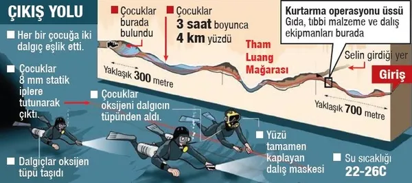 Tayland'ın kuzeyindeki Çiang Rai eyaletinde, takım olarak ziyaret ettikleri mağara kompleksinde 23 Haziran'da kaybolduktan 9 gün sonra sağ olarak bulunan 12 futbolcu çocuktan 4'ü kurtarıldı. Kyodo'nun haberine göre 4 çocuk, Tham Luang Nang Non Mağarası'ndan yerel saatle 17.30 ve 18.00'de çıkarıldı. Çocuklara, bulundukları yerden çıkarılışları sırasında 2 dalgıç eşlik etti. Çocukları hastaneye taşımak için iki helikopter seferber oldu. Tayland İçişleri Bakanı, çocukların tedavi altına alındığı hastaneye gitti. Doktorların sağlık durumuna göre kurtarılmasına öncelik verilecek çocukları belirlediği belirtiliyor.