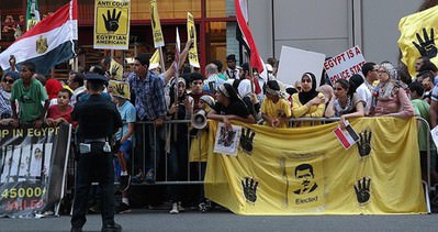 New York'taki Mısır'ın BM Daimi Temsilciliği'nin karşısında toplanan bir grup, ''Özgür Mısır'' sloganları atarak Times Meydanı'na yürüdü.