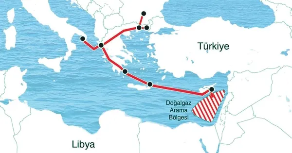 EastMed projesiyle Doğu Akdeniz'deki gazın Güney Kıbrıs Rum Yönetimi (GKRY) ve Girit Adası üzerinden Yunanistan'a, oradan da İtalya üzerinden Avrupa'nın iç kısımlarına ulaştırılması planlanıyor.