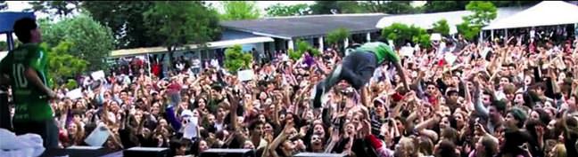 Brezilya'nın Chapeco kentinde düzenlenen festival kapsamında "sahne dalışı" yapan yani sahneden izleyicilerdin üzerine atlayan genç şarkıcı kötü bir sürprizle karşılaştı: Grup solisti "Kafamı Kontrol Ettirdim" şarkısını zıplayarak söylerken, birden seyircilere doğru koşarak sahneden balıklama atladı. İzleyicilerin kendisini tutacağı sanısıyla sahneden atlayan genç solist, yüz üstü yere çakıldı. Kalabalığın yanında toplandığı genç solist, güçlükle de olsa ayağı kalkmayı başardı. Meraklı bakışlara maruz kalan genç solist, daha sonra kendisini tutmayan izleyiciler ile alanda kafa sallayıp zıplayarak eğlendi. Ancak bir süre sonra sahne yakınına gelen solist, tutunarak ayakta durmaya çalıştı. Yakında bulunan izleyiciler, solistin kafasını kontrol ederken grup üyeleri müzik çalmaya devam etti. Şans eseri yaralanmayan solist ve grup üyeleri konserlerinin bitmesinin ardından alandan ayrıldı. DIŞ HABERLER