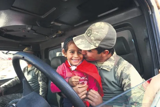 Çok sayıda çocuk, 2 kilometre yol yürüyerek Oğulpınar Sınır Karakolu'nun kontrol noktasına ulaştı. Burada askerlere koşan çocuklar, "Türkiye sizinle gurur duyuyor" sloganları attı. Bir kız çocuğunu askeri araca bindiren bir asker ise "Çok mutlu oldum, gururlandım" dedi.
