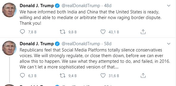 Trump, Twitter'a tepki göstererek Twitter üzerinden yaptığı paylaşımda, "Cumhuriyetçiler Sosyal Medya Platformlarının muhafazakâr sesleri tamamen susturduğunu hissediyor. Bunun bir kez daha olmasına izin vermemek adına onları güçlü bir şekilde düzenleyeceğiz veya kapatacağız.