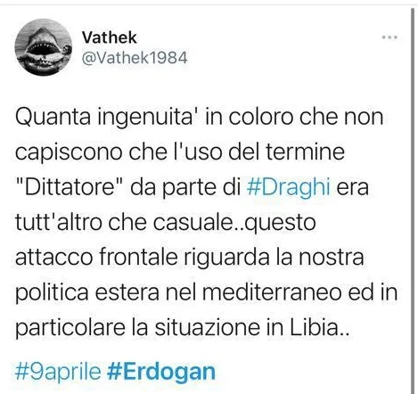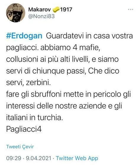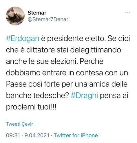Son Dakika Haberi... Avrupa Birliği'nin protokol kuralları ve taleplerinden habersiz olduğu ortaya çıkan ve Başkan Erdoğan'a çirkin sözlerle saldıran İtalya Başbakanı Draghi skandal ifadeleri sonrasında kendi halkı arasında da alay konusu oldu. Diğer yandan İtalya'nın Ankara Büyükelçisi Gaiani, Başbakan Draghi'nin Başkan Erdoğan'a yönelik küstah sözleri nedeniyle Türk Dışişlerine çağrıldı.
