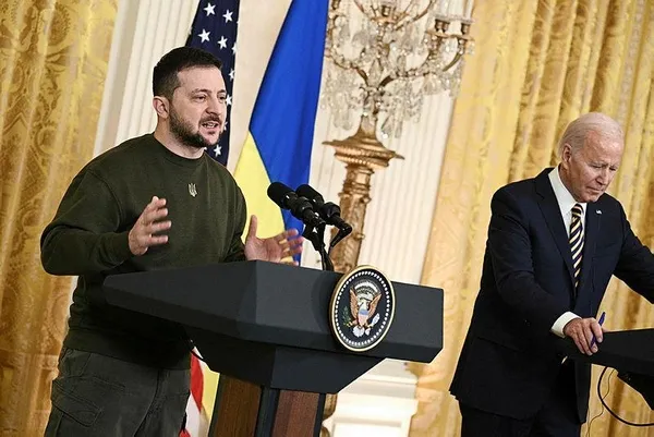 Rusya'nın ülkesine savaş başlattığı 24 Şubat'tan bu yana ilk yurt dışı ziyaretini yapan Ukrayna Devlet Başkanı Zelenskiy ile ABD Başkanı Biden, Beyaz Saray'daki ikili görüşmelerinin ardından ortak basın toplantısı düzenledi.