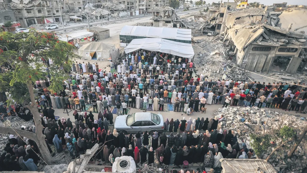 Gazzeliler, Ramazan Bayramı'ndan sonra Kurban Bayramı'na da açlık, kıtlık, ölüm ve yerle bir edilen evlerinin enkazlarıyla girdi. Terör devleti İsrail bayram günü de saldırılarına devam etmesine rağmen Gazzelilerin bayram sevincini, direniş azmini ve geleceğe dair umutlarını kıramıyor. Gazzeliler İsrail füzeleriyle yok edilen camilerin yıkıntıları arasında bayram namazlarını kılarken kadınlar ise evlerinin enkazları üzerinde çocuklar için geleneksel kurabiyeler pişirdi. Filistinliler, Gazze Şeridi'nin güneyindeki Han Yunus'ta, İsrail hava saldırılarında yıkılan Rahma Camii kalıntılarının arasında Bayram namazını kıldı.