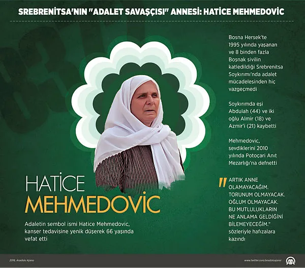 Soykırımda 44 yaşındaki eşi Abdulah, oğulları 21 yaşındaki Azmir ile 18 yaşındaki Almir'in yanı sıra çok sayıda akrabasını kaybeden Mehmedovic, savaştan sonra 2002'de yüreğindeki acıya rağmen Srebrenitsa'ya geri dönerek adalet mücadelesini yerinde devam ettirdi.