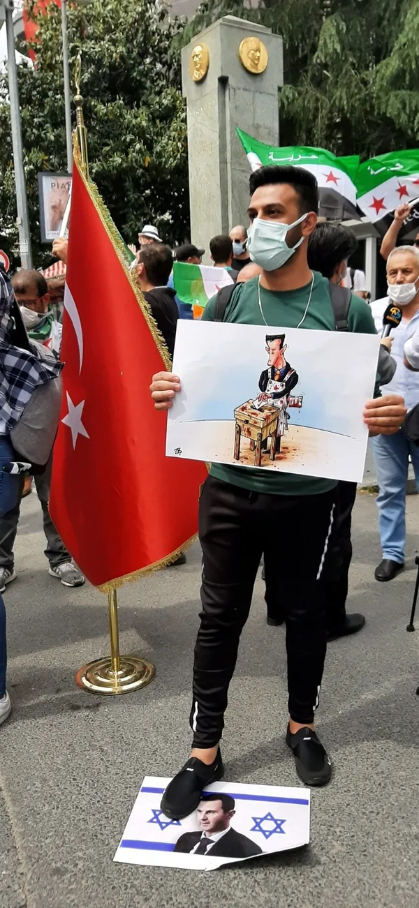 Harbiye'deki Suriye Başkonsolosluğunun bulunduğu caddede toplanan yaklaşık 30 kişilik grup, ellerinde Suriye devrimini temsil eden Özgür Suriye bayrakları taşıyarak, Beşar Esad'ın fotoğrafının bulunduğu broşürleri yere attı.