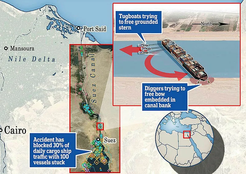 Mısır'da Tayvanlı Evergreen Marine şirketi tarafından işletilen 400 metre uzunluğundaki Ever Given yük gemisi, hafta içinde 200 metre genişliğindeki Süveyş Kanalı'nın güneyinde çapraz olarak karaya oturdu. Gemiyi kurtarıp deniz trafiğinin açılması için uzmanların önerdiği kurtarma senaryolarından geminin yükünü boşaltarak hafifletme seçeneğinin, tehlikeli olduğu ve gemiyi dengesiz hale getirip ikiye bölebileceği belirtildi.