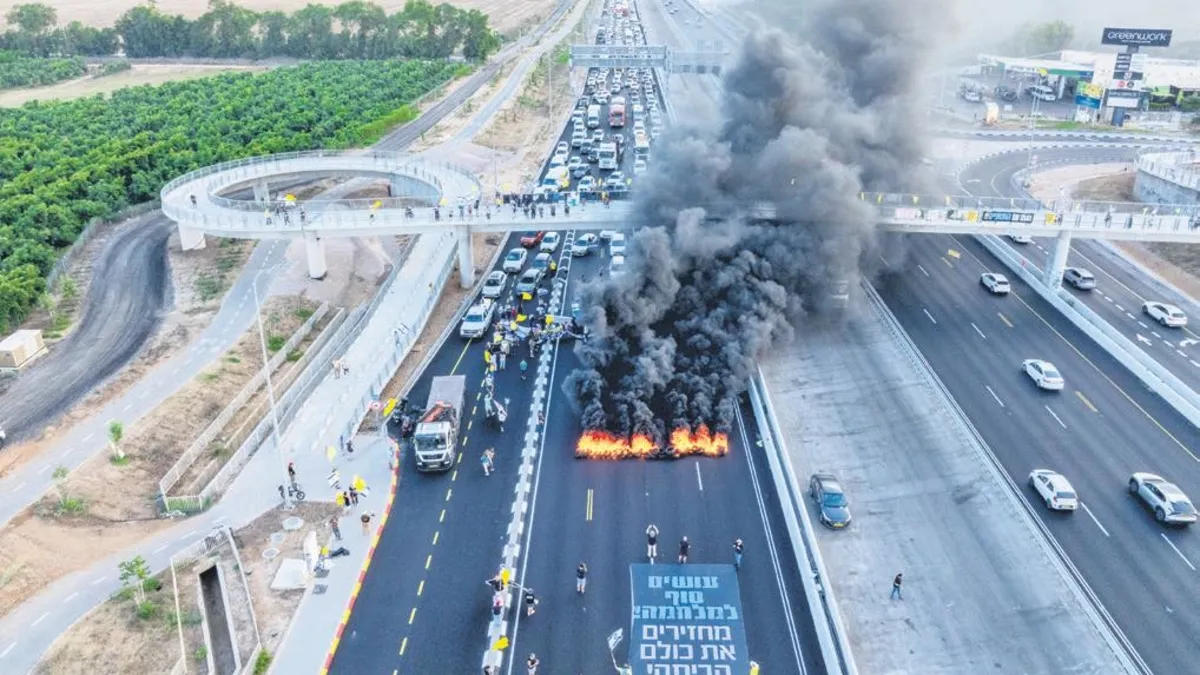 Tel Aviv'in ana arterlerinden Ayalon otoyolu dahil olmak üzere Kudüs'e giden 1 numaralı otoyolu sabah erken saatlerden bu yana trafiğe kapatan protestocular, ülkeyi Akdeniz sahili boyunca kuzeyden güneye kateden 4 numaralı otoyolda da uzun süre eylem yaparak trafik akışını engelledi. Yol kapatma eylemleri gerçekleştiren bazı göstericilerin yollarda lastik yaktığı görüldü. İsrail'in Gazze Şeridi'ne saldırılarını sona erdirerek derhal masadaki ateşkes ve esir takası anlaşmasını imzalamasını isteyen onlarca gösterici de bakanların evinin önünde protesto düzenliyor. AA
