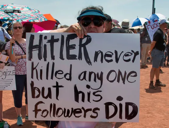 Donald Trump'ın hastane ziyareti sürerken hastaneye yakın bir bölgede toplanan kalabalık gruplar, Trump'ı protesto etti. Ellerinde pankartlarla ABD Başkanı Trump'ı "beyaz ırkçılara karşı hiçbir şey yapmamak"la suçlayan göstericiler, Trump aleyhine sloganlar attı.