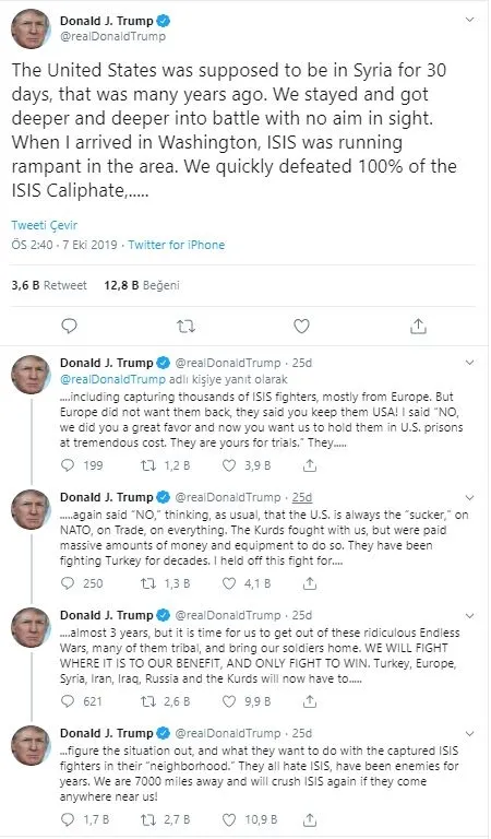 Trump, Twitter hesabında art arda yaptığı paylaşımlarda, "Terör örgütü YPG/PKK , bizimle savaştı ancak bunu yapmaları için onlara çok para ödendi ve teçhizat verildi. YPG/PKK, yıllardır Türkiye'ye karşı savaşıyorlar. Bu savaşı 3 yıl boyunca engelledim ancak bizim için bu saçma, çoğu aşiret kaynaklı, sonu gelmez savaşlardan uzaklaşmamızın ve askerlerimizi eve geri getirmenin artık zamanı." ifadesine yer verdi.